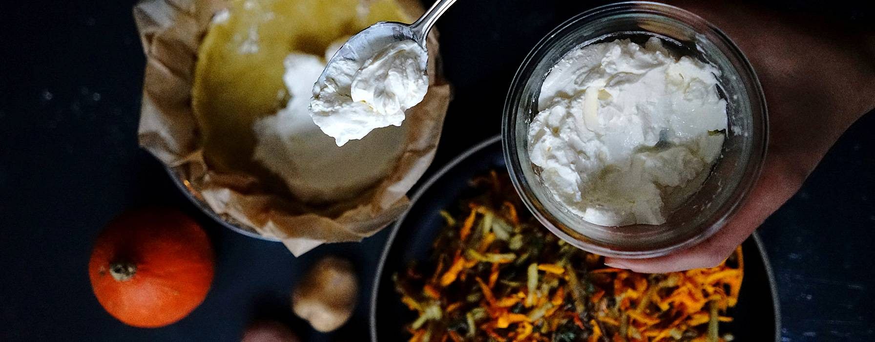 Le traiteur Culinary Misfits sauve des légumes qui ne répondent pas forcément aux critères de beauté des grands supermarchés. Ils les utilisent pour créer de délicieuses créations culinaires comme cette recette de tarte au potimarron et à la pomme de terre sur une pâte à l'épeautre, garnie de crème aigre, d'herbes et de graines de courge. Ce plat sain et simple peut être mangé chaud ou froid et se marie à merveille avec une salade ou des crudités.