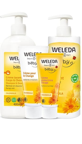 La Crème pour le Change au Calendula, adorée des mamans et des bébés, protège la peau. Riche en plantes apaisantes, elle réduit les rougeurs et régénère l’épiderme. La Crème protectice Visage au Calendula hydrate la peau et soutient ses fonctions naturelles, pour nourrir et protéger au quotidien. De texture onctueuse, cette crème pénètre rapidement sans laisser de film gras. L’Huile de Massage Vergetures, à l’extrait de fleur d’arnica et à l’huile d’amande douce, aide à prévenir l’apparition des vergetures.